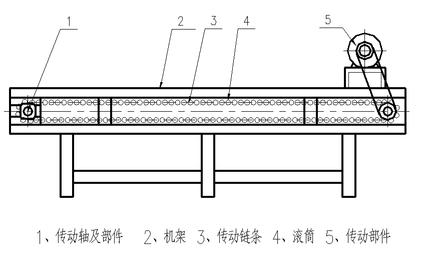 该机在输送过程中,滚筒两边有链条带动,滚筒上面承载原料,电机带动链条作公转的同时,滚筒在机架上由于两头齿轮与垫条磨擦力的作用作自转运动。这样就使原料在滚筒上作360°翻滚,便于工人对果蔬原料进行检选。不合格的原料可以放在废果输送区,随输送带向前落入废料斗中,收集后运出。合格的原料由出料斗进入下道工序。