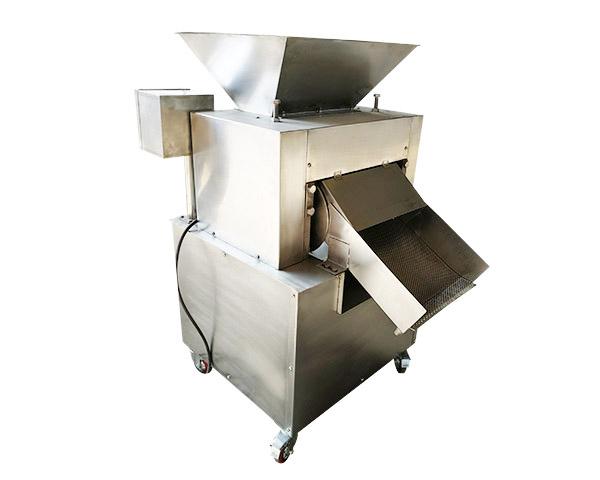 工作原理:飞刀绕自身轴线在固定不动的底刀间隙内旋转,从而使果蔬破碎,转子上有四组飞刀,底刀为一组,视果蔬种类不同,出料斗有斗式和管式两种型式。在进料斗上部加上缓冲装置,可得到粒度更细的物料。