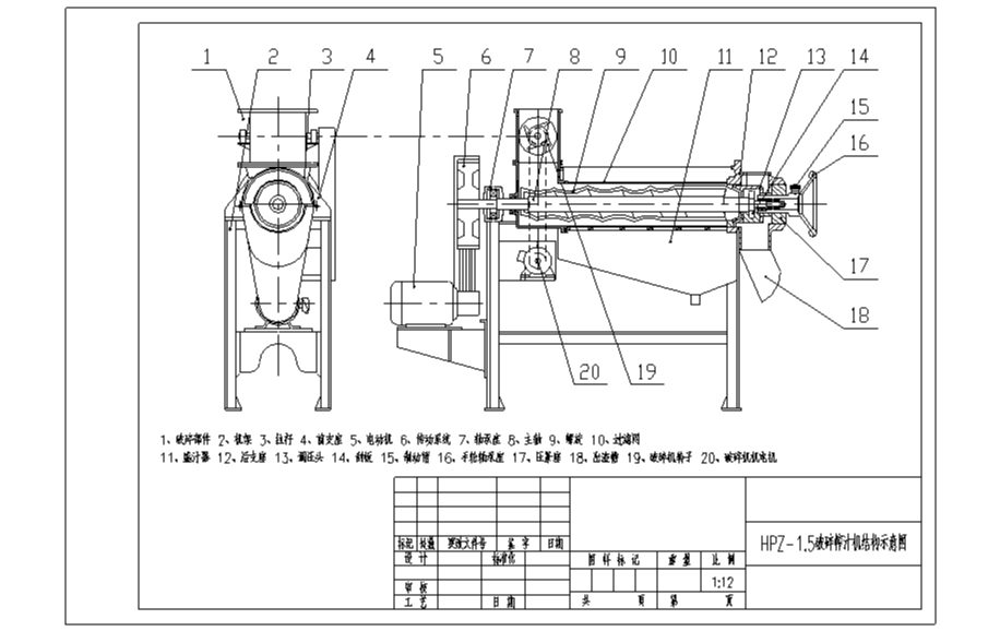 由前支座、进料斗、螺旋、过滤网、盛汁器、后支座、出渣槽等零件组成,螺旋主轴左端支承于滚动轴承座内,右端支承于手轮轴承座中,电动机通过一对三角皮带轮驱动螺旋进行工作。