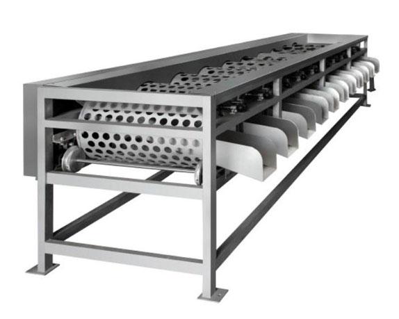 本设备是全不锈钢果蔬分选机械,是由上果输送机和滚杠式分选机组成;上果输送机通过滚杠自动旋转来达到均匀上料,滚杠式分级机根据果蔬直径大小来分选;