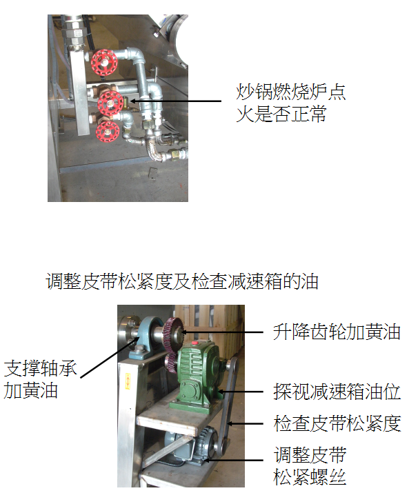 5.   检查炒锅燃烧炉点火是否正常。                    (M 保养)
