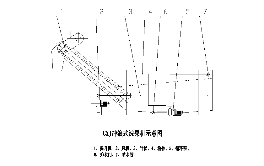 该机由机架、水箱、风机、提升机、气泡管、喷水管等几部分组成,工作时由于水中风力的存在,蔬果在水中任意方向翻滚转动,并在高压水力的推动下向前移动,在出口由一刮板提升机,将果蔬送至下道工序。整体为分体式结构,水箱与输送机、进出料斗、罩板方便拆卸,易于清洗和检修。