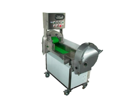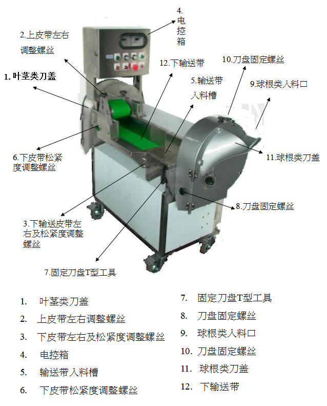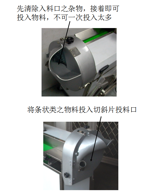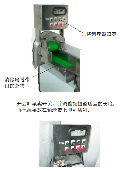 3.开启叶菜类摇头开关,并刀片输送带调整适当的长度 (依输送带的速度决定切出产的长度),把蔬菜放在输送带上即可切削。