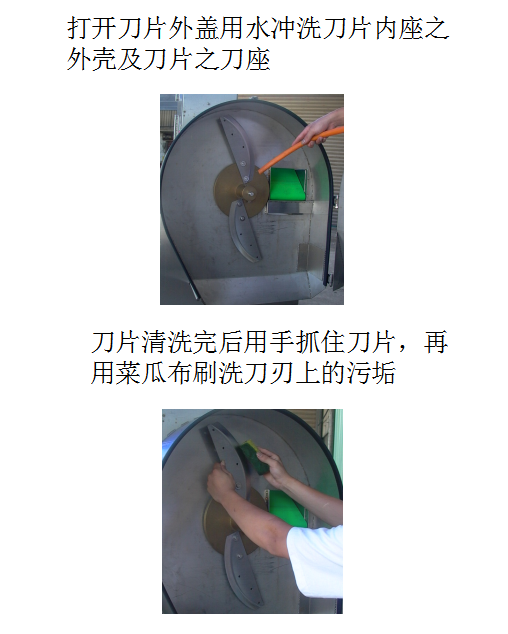 1.让输送带运转,用水冲洗上下输送带,清洗完毕后将摇头开关关闭,即可清洗刀片。