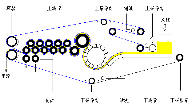 工作时经过细化的原料(固液混合物),有螺杆泵连续进入料斗中(物料占带宽可调节),内外两条环状滤带在驱动辊带动下,由压料辊分布均匀。在下弯的楔形区内,按其各自回路运动,内外滤带绕过数根不等径的榨辊,大量水分被缓缓地压出,形成可压榨的率饼。在压榨区内,一个带“L”型压条的压辊将水份压出,并保证水份从两边压出。以后的压辊直径递减,滤带呈“S”型,产生递增的表面压力的剪切力。在滤带张力作用下外层滤带对物料产生压力将物料中的汁液榨出,由于榨辊直径逐渐减小,滤带间物料所受压力逐渐增加,汁液不断排出。为了保证脱水效果,然后物料再绕过驱动辊,在榨辊下有二级压力不同的衬胶压辊对滤带自动加压,进一步将物料中的汁液排出干净,提高出汁率。在内外滤带分开后,有耐磨型料刮装置将内外滤带工作表面上脱水后的滤饼(果渣)刮下,(为提高刮渣效果,方便榨带清洗,用户可选择增设毛刷进一步刷渣),由我公司引进国外的高压实心锥形凸型喷嘴,形成扇形交叉,压力在大于1MPa下,流率为4140升/分的情况下不断冲洗,以保持持续的高压效果。