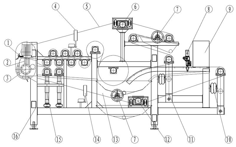 见附示意图, 该机有机架、上下驱动轴,减速驱动总成,压辊组合,压滤带、清洗带组件、进料组件、涨紧装置、带纠偏组件、增压装置、安全保护装置,气电控制装置、清洗水过滤装置等组成。